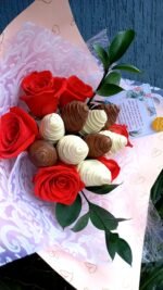 Arreglo de 7 deliciosas fresas cubiertas y decoradas con chocolate más 6 hermosas rosas (color sujeto a disponibilidad)