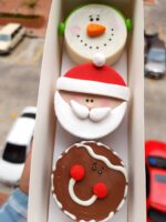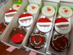 Estuche de 3 Galletas oreo cubiertas con chocolate blanco y/o café, acompañadas con relleno de arequipe o frutos rojos, decoradas con fondant de lindos estilos navideños.